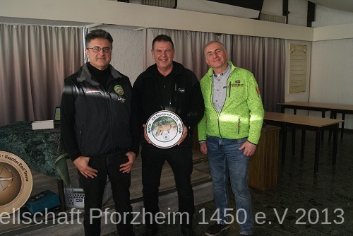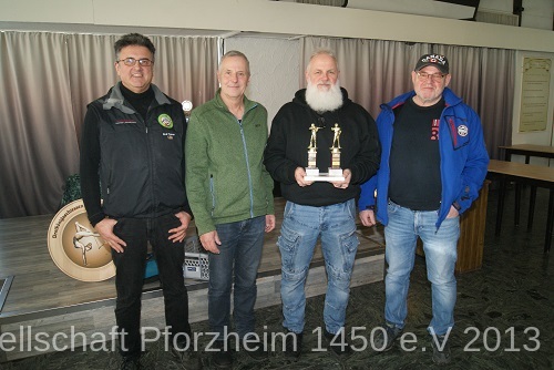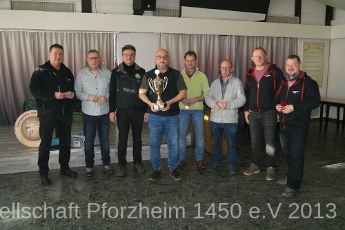 Hohe Ehre gilt dem Sportler, der sowohl Lang- als auch Kurzwaffe am besten beherrscht, hierzu wurden 2 weitere Schüsse abgegeben: unserem Grosskaliber-KW-Schiessleiter Peter Schäfer gelang es sowohl mit dem KK-Gewehr als auch mit der KK-Pistole eine Punktesumme von 19,7 zu schiessen und entschied den von Peter Voitl gestifteten KK-Jahreswanderpokal für sich, in Summe mit einem geringen Vorsprung von jeweils 0.4 Ringen vor Reinhardt Knaus und einem Ring vor unserem Sportlichen Leiter Peter Voitl.