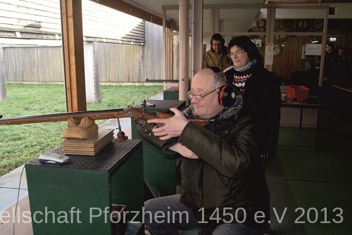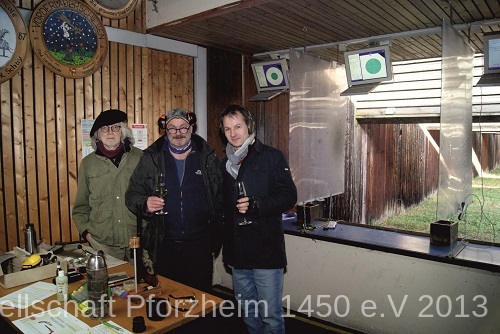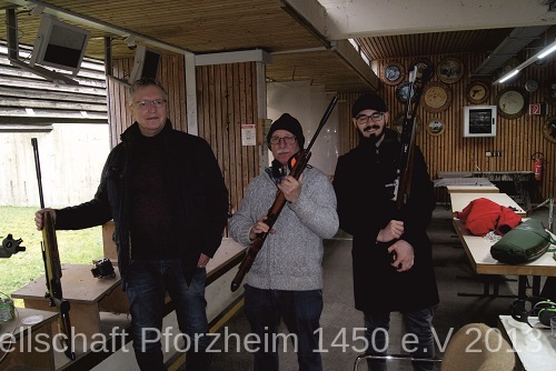 Die Gäste - im übrigen nicht alle aktive Sportschützen - haben anschließend das Traditionelle Dreikönigschiessen gefeiert: mit Vorderladerwaffen aus dem 19. Jahrhundert, allesamt mit Schwarzpulver und Bleigeschoss geladen und mit Perkussionszündung befeuert. Die Herausforderung war auf 50m mit Gewehren und auf 25 mit Pistole und Revolver die Scheibenmitte zu treffen. Aymeric Deprey hat es mit einem Ergebnis von 19,9 vorbildlich geschafft und den 1989 von Jürgen Hirschmann gestifteten Vorderlader-Langwaffenwanderpokal für sich entschieden – denkbar knapp vor Marvin Wendt (19.6) und Frank Baltruweit (19.2).